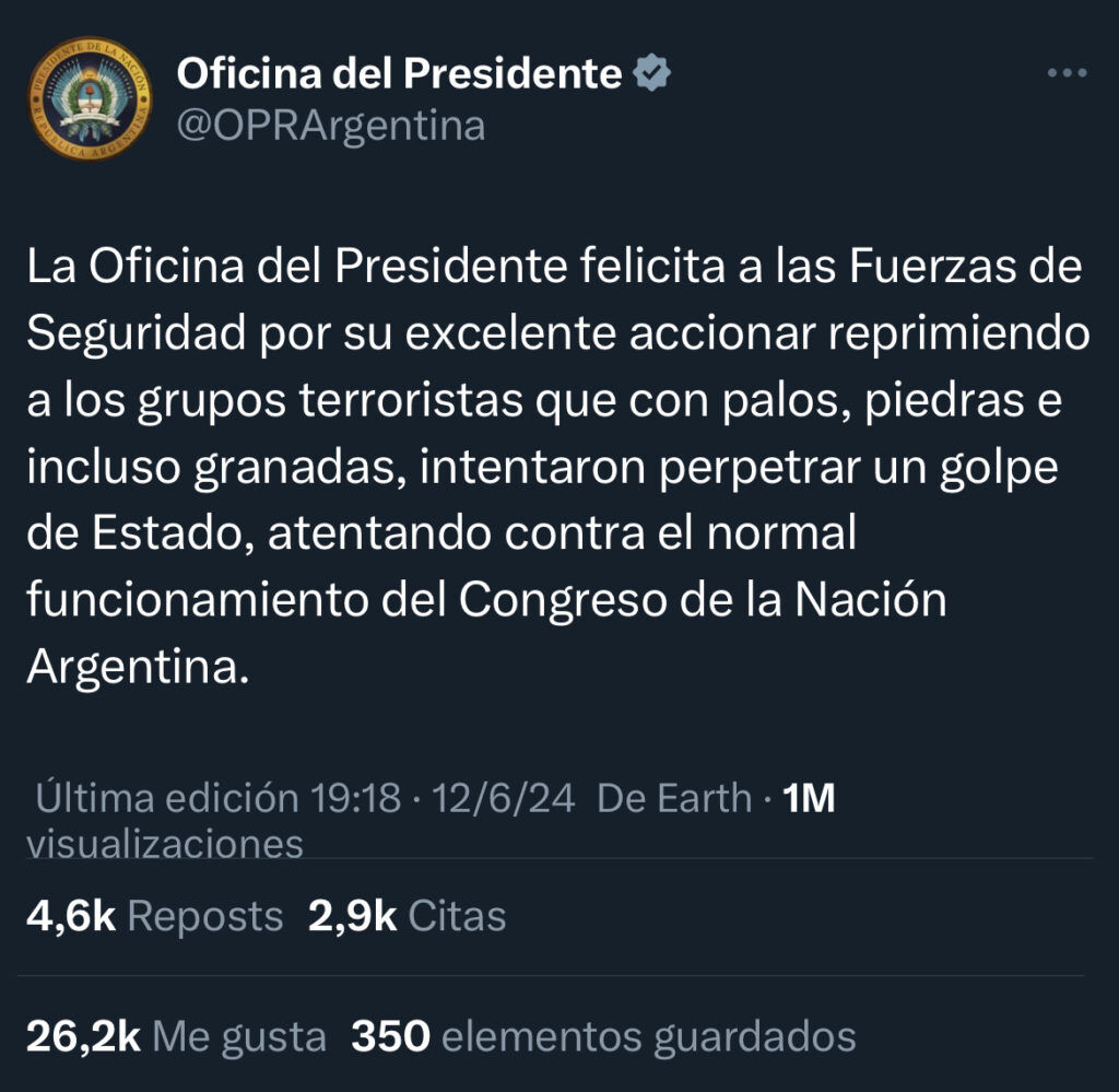 A través de un mensaje de la Oficina del Presidente en la cuenta oficial de X, la administración nacional reivindicó el avance de la policía en las afueras del Congreso contra «terroristas que con palos, piedras e incluso granadas, intentaron perpetrar un golpe de Estado, atentando contra el normal funcionamiento del Congreso de la Nación Argentina».