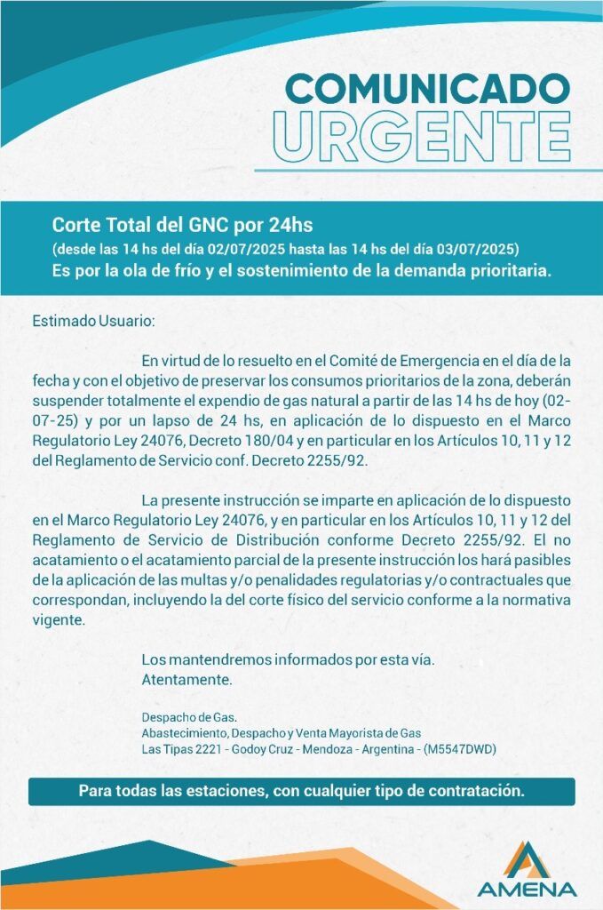 Las bajas temperaturas en todo el territorio provincial han ovacionado una gran demanda de gas domiciliario, ante esta situación el comité de emergencia emitió un comunicado donde se informa un corte total en el expendio de Gas Natural Comprimido (GNC) en todas sus estaciones de servicio. La medida, anunciada por la Asociación Mendocina de Expendedores de Naftas y Afines (Amena), comenzó este miércoles a las 14 y se extenderá por 24 horas, hasta mañana jueves a la misma hora.