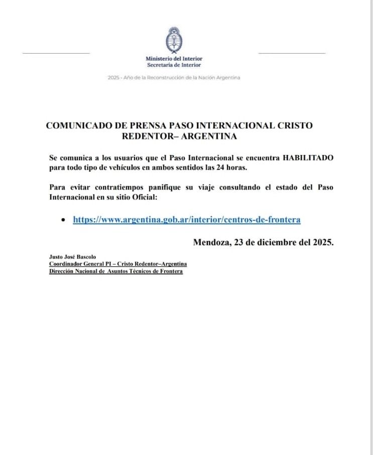 Mendoza – El Sistema Integrado Cristo Redentor mantiene su habilitación las 24 horas del día para el paso de transporte de cargas, ómnibus y vehículos particulares, facilitando el flujo transfronterizo en la ruta hacia Chile durante las vacaciones de fin de año. Autoridades viales reportan condiciones transitables sin nevadas ni obstrucciones, pero las bajas temperaturas en la zona alta demandan precauciones para evitar riesgos por heladas.